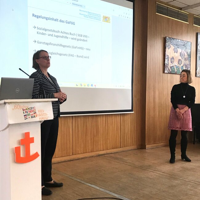 Zunächst berichtete Dr. Alexa Glawogger-Feucht, Geschäftsführerin des Verbands über aktuelle Kita-Themen vom Bündnis für frühkindliche Erziehung, über Kita-Finanzierung bis zum KiPrax Modellversuch und Landeselternbeirat. Im Anschluß stellten Nora van de Sand (StMAS) und Simone Schrammer (StMUK) den aktuellen Stand des Ganztagsförderungsgesetzes in Bayern übersichtlich vor und beantworteten Fragen.