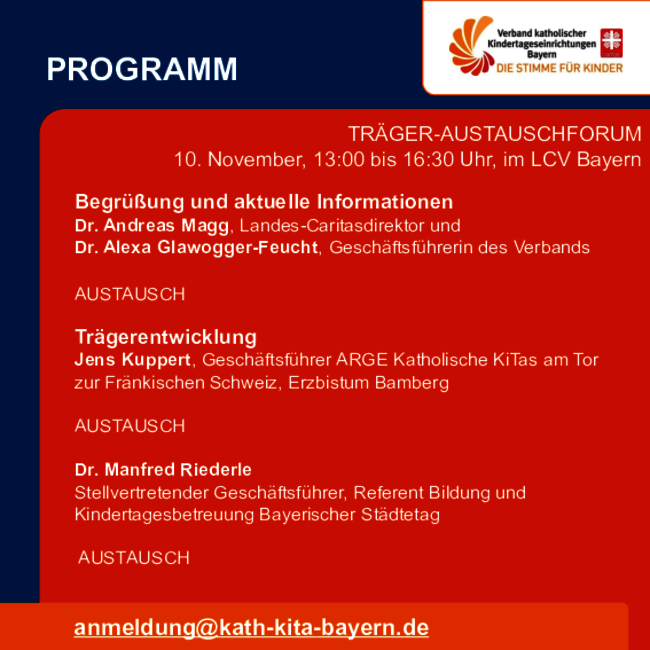 Es wird zwei Träger-Austauschforen für alle interessierten Träger und Trägervertreter:innen, die Mitglied im Verband sind, geben. Der Verband freut sich durch dieses Format noch mehr Vernetzung unter den Kita-Trägern in Bayern zu ermöglichen.