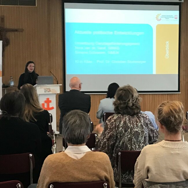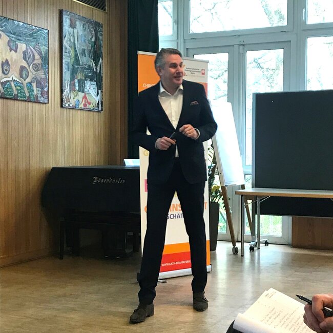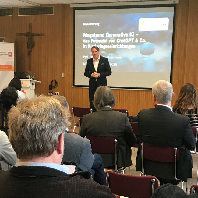Nach einem intensiven Austausch galt die Aufmerksamkeit dem KI-Experten Prof. Dr. Christian Stummeyer von der TH Ingolstadt. In seinem Impuls-Vortrag: Megatrend Generative KI – das Potenzial von ChatGPT & Co. in Kindertageseinrichtungen zeigte er die Entwicklung des Bereichs KI detailliert auf, gab Informationen zum derzeitigen Stand generativer KI und zu Large Langue Modells und informierte über Trends. Prof. Dr. Stummeyer formulierte abschließend: "Es braucht ein ethisches Grundgerüst, um Künstliche Intelligenz zu formen" und "Wir brauchen Mut, Offenheit und Neugierde – und lebenslanges Lernen!"