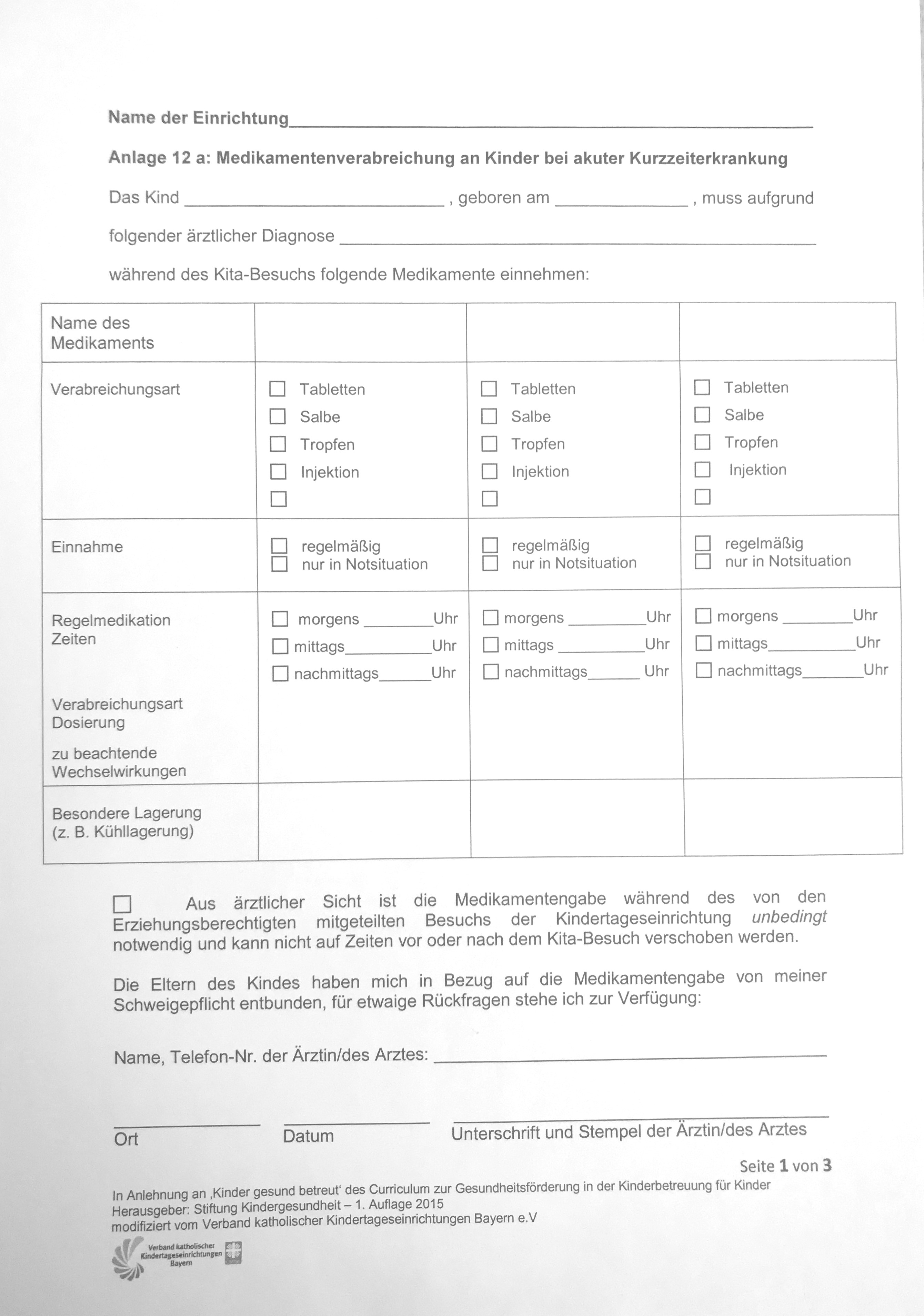 Anlage 12a: Medikamentenverabreichung bei akuter Kurzzeiterkrankung
