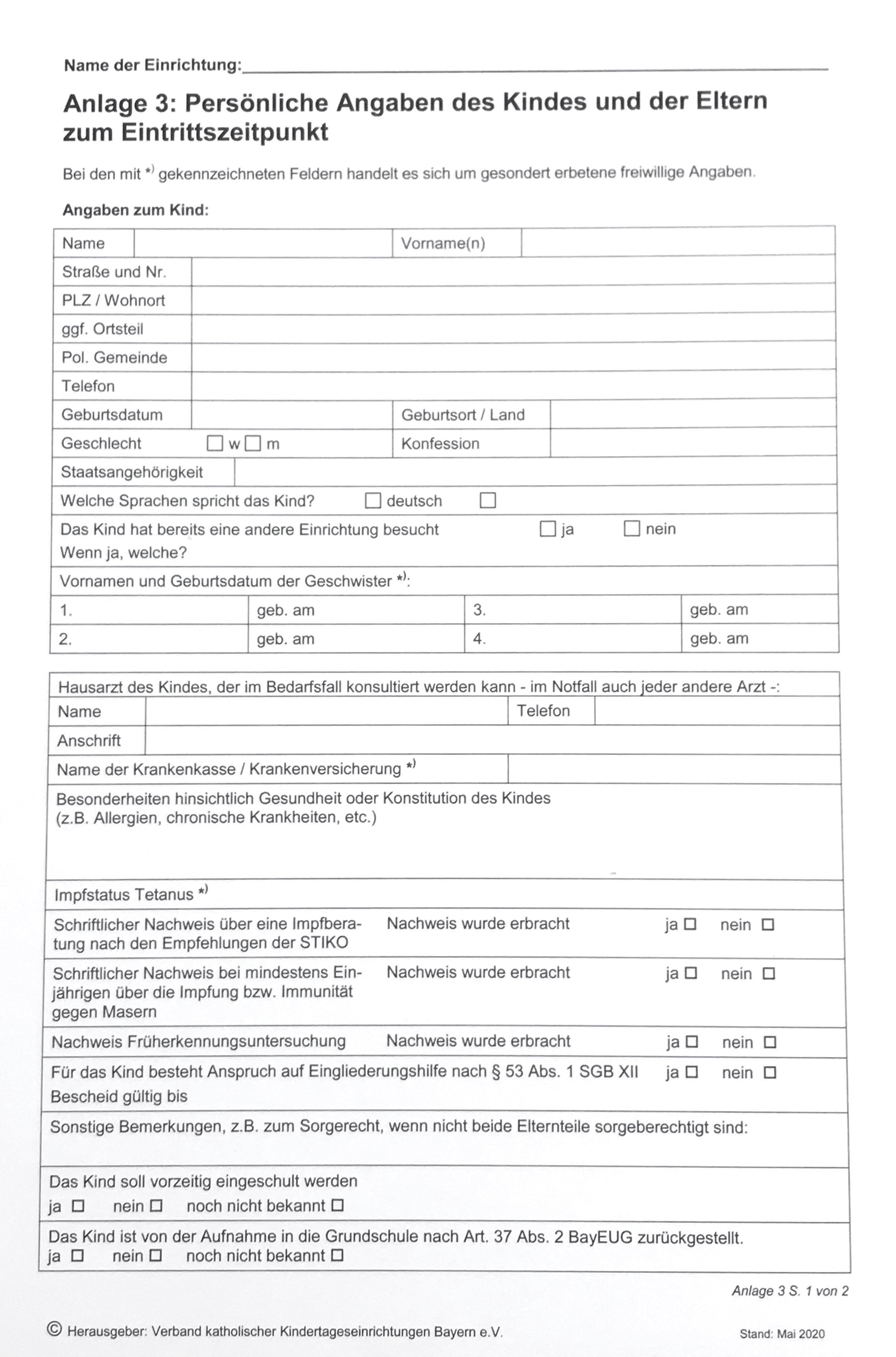 Anlage 3: Persönliche Angaben des Kindes und der Eltern